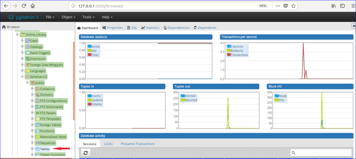 Click on ‘Schemas’ section of ‘Online_Library’ database. Expand ‘public’ section and find out ‘Tables’ section.