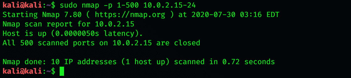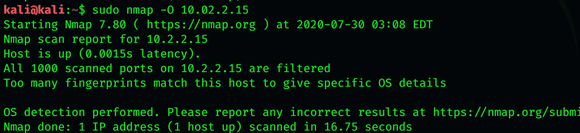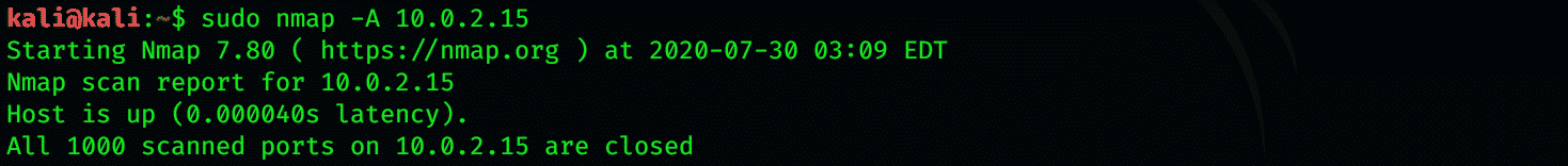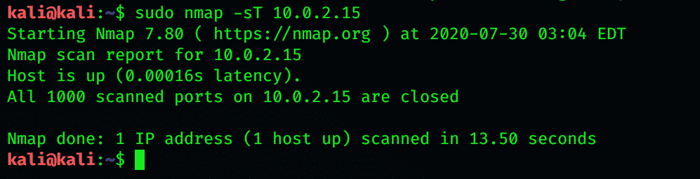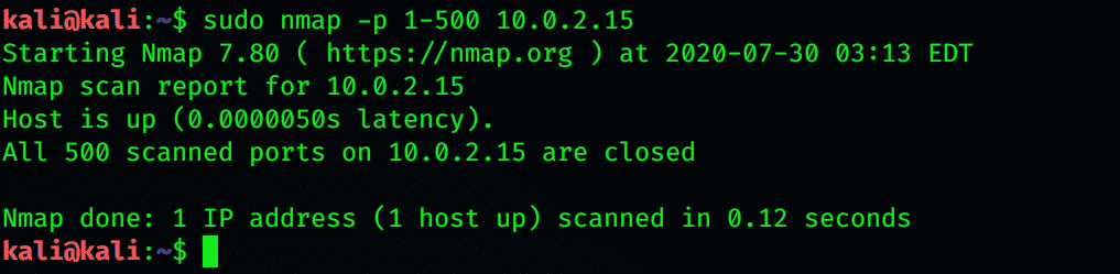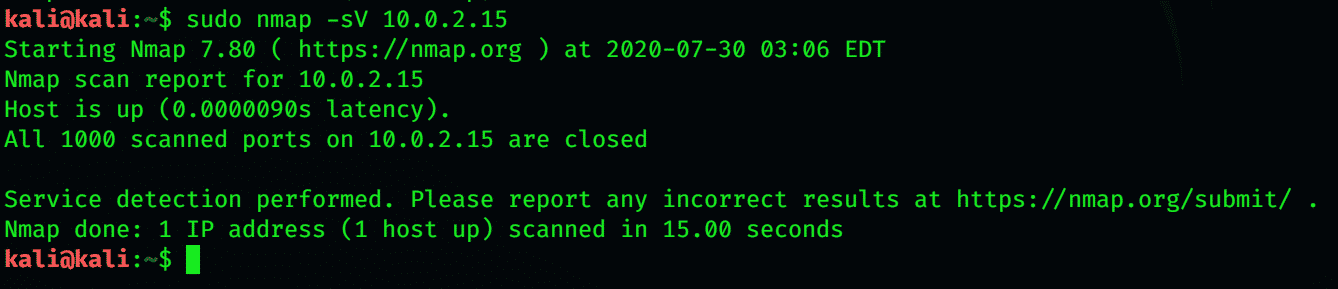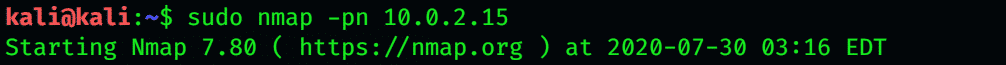 In your Linux, Windows, or Mac terminal, type Nmap to perform your scan, including the option and the target specifications. You can pass hostnames, IP addresses networks, etc. Nmap 10.0.2.15 [Target or any I.P Address]. A scan medium map is a great place where you can test your scanning.