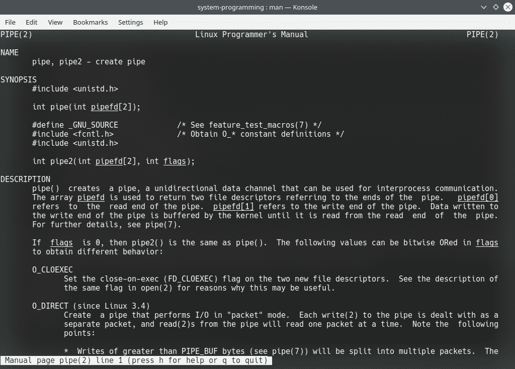 For more information on the pipe() system function, check the man page of pipe() with the following command: