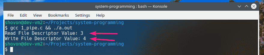 If you run the program, you should see the following output. As you can see, the value of the read pipe file descriptor pipefds[0] is 3 and write pipe file descriptor pipefds[1] is 4.