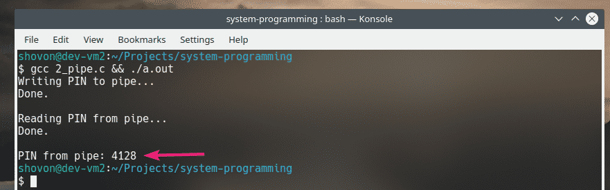 To write 5 bytes of data (pin) into the pipe, I used the write() function using the write pipe file descriptor pipefds[1] as follows.