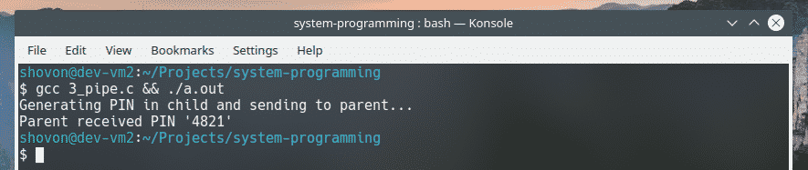In this example, I showed you how to use pipe for inter-process communication. I’ve sent a PIN from the child process to the parent process using a pipe. Then read the PIN from the pipe in the parent process and printed it from the parent process.