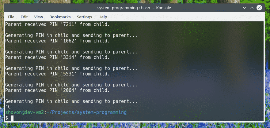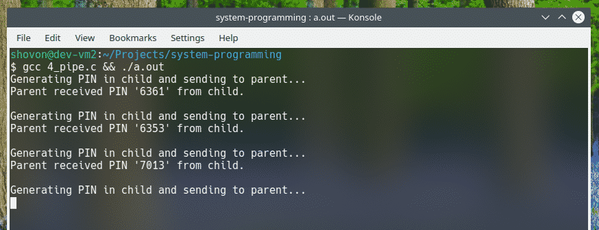 This example is the same as Example 3. The only difference is that this program continuously creates a child process, generates a PIN in the child process and sends the PIN to the parent process using a pipe.