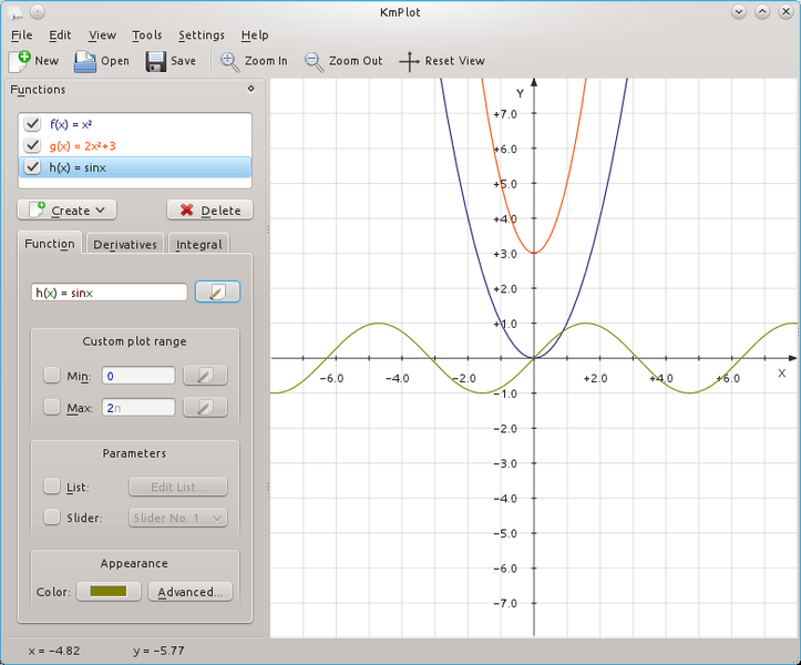 KmPlot is a KDE suite program that is used to plot a graph of a function and its integrals or derivatives. It is a fantastic mathematical plotter. KDE is capable of plotting different functions simultaneously and combining them in a new function. All of these graphs can be colorized, and views are scalable, zoomable, and configurable. KmPlot program offers a fantastic mathematical parser and multiple plot types such as polar, implicit, differential, parametric, etc.