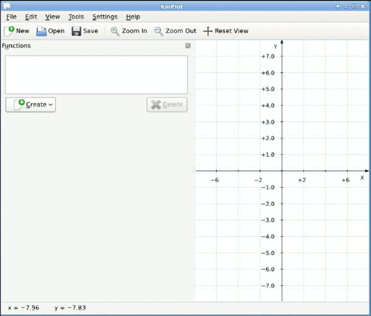 After opening the KmPlot, you will get a blank space for starting mathematical functions in it. There is a function list window on the left side of the screen in which you can select the functions to work on your project. There is a main plotting window at the right side representing all of the changes occurring in a graphical display.