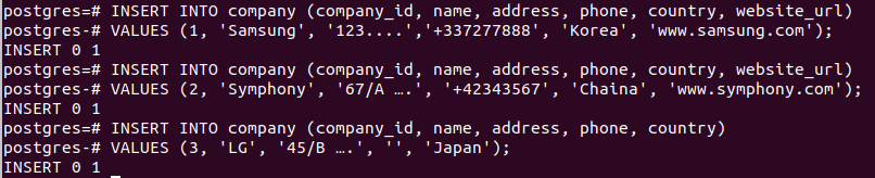 VALUES (1, 'Samsung', '123....','+337277888', 'Korea', 'www.samsung.com');