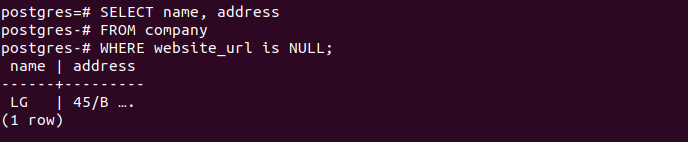The following query will retrieve all name and address data from company table where website_url value is null. There is only one record where the website_url value is NULL.