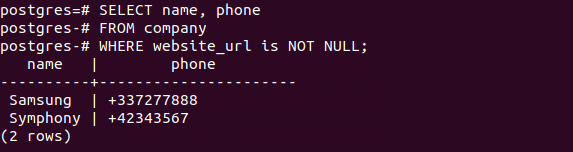 The output of NOT NULL is opposite of NULL. The following select query will return all records from company table where website_url field contains any data.