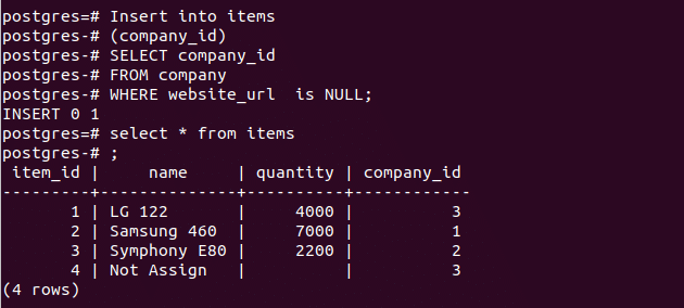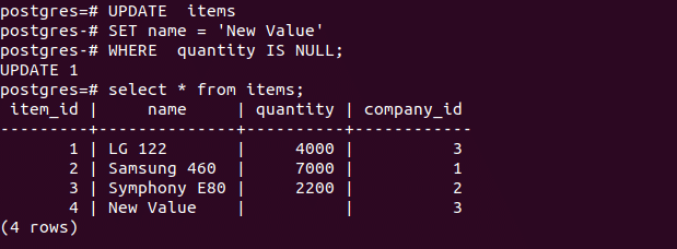 name field value of items table will be updated which record contains NULL in quantity field. According to the data, one record will be updated after executing the query.