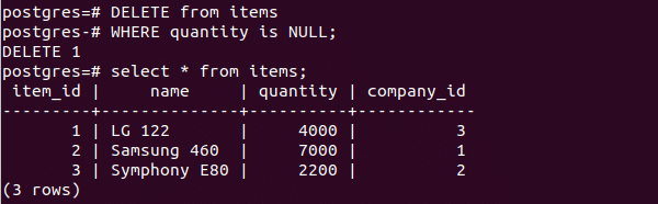 The following query will delete records from items table where quantity value is NULL. There is only one record in items table where quantity value is NULL. So, one record will be deleted after executing the query.