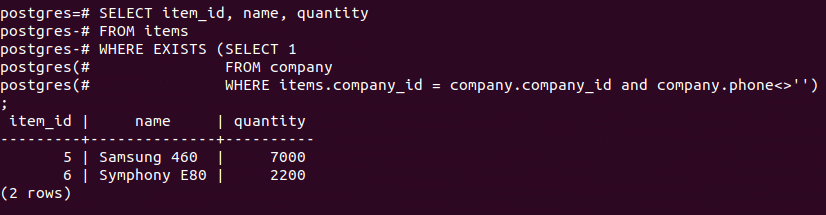 The following query will retrieve records from items table based on company table. The subquery searches all records from company table where company_id of company table is equal to company_id of items table and the value of phone field is not empty. There is one record in company table that does not have phone number and this record will be omitted from the output.