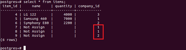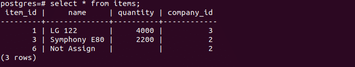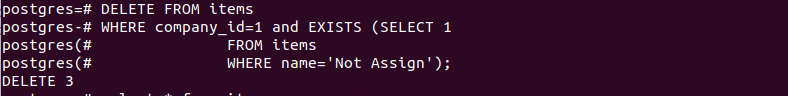 There are three records with value 1 of company_id and one record has name value ‘Not Assign’. So, the condition will true for three times and delete three records from items table.