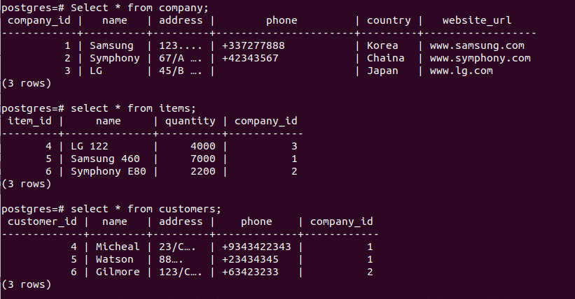 Create three tables named company, items and customers and insert some data. Run the following select query to show the contents of these tables.