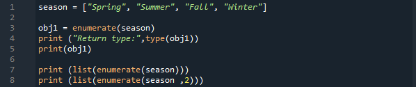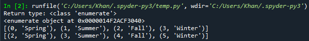 You can also check the type of a given object using the ‘type’ keyword in the method. Here is a simple model of a list having 4 seasons mentioned. The list ‘season’ has been converted into an enumerating class and saved into variable ‘obj1’. In the third statement, the object type of this list has been printed. At the next line, this enumerated ‘obj1’ will be printed out. After that, list season has been enumerated and converted again into a list while printing.