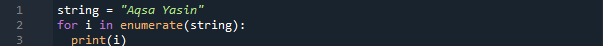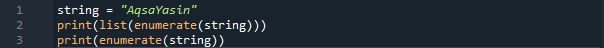 Now we have to enumerate a string using the for loop in our example. So let’s have a look at the code shown in the picture. We have a string with the value ‘Aqsa Yasin’. We have enumerated this string using the enumerate function in for loop, then print it.