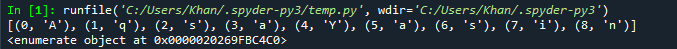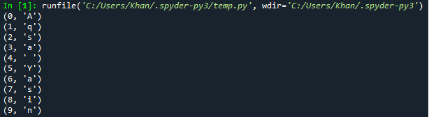 The below output will be generated. The first line of output shows the enumerated and converted it into the list format of the string, while the other line only shows the enumerated generator object address of the string.
