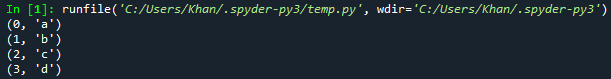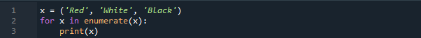 Let us use the same example again, with just a little amendment in it. We have defined a tuple ‘x’, enumerated it in the ‘for’ loop, and then printed it out. You can also use ‘i’ instead of the tuple name right after the for loop started.
