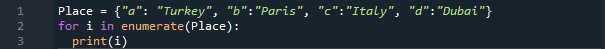 We are going to enumerate a dictionary using the for loop in this example. So let’s have a look at the example shown in the attached picture. We have a dictionary named ‘Place’, with some values in it as the country’s names. We have enumerated this dictionary using the enumerate method in for loop, then print it.