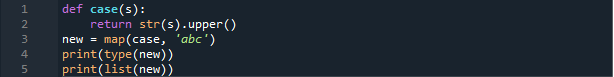 We are using the case function to convert a string into the upper case while performing the mapping. After that, we will find the type of a new variable and convert it into a list type to show it in a sequence.