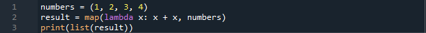 Within Python, to create anonymous methods, lambda functions are used. To describe regular functions, you would be using the lambda term just like you use def. Here is an example of a simple tuple named ‘numbers’. Lambda expression is used within the map function to calculate some value, while the result has been saved and printed.