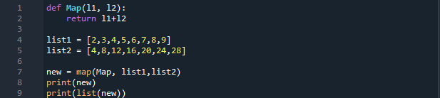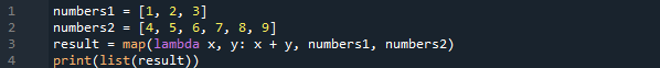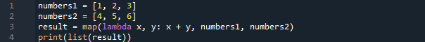 The map works the same for multiple arguments in lambda. Below is an example of two list having elements been added.