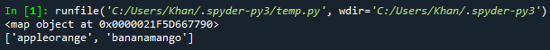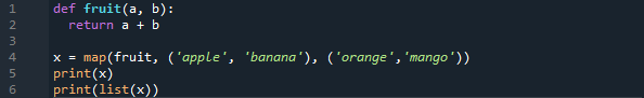 Here is an example to concatenate two tuples having string values. We have a function ‘fruit’ taking two arguments. Value at the first index of the first tuple will be concatenated with value at the first index of the second tuple by the ‘fruit’ function and so on for other values as well. The concatenated value will be returned to the map function to do mapping and save to one variable ‘x’. After that, variable ‘x’ will be printed in map format as well as in list format.