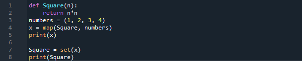 There is a list of items being squared. It will then be mapped and converted into a set type to print it in a set format.