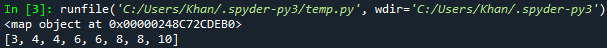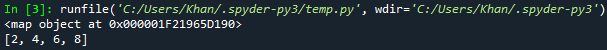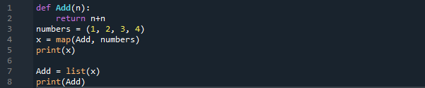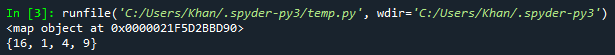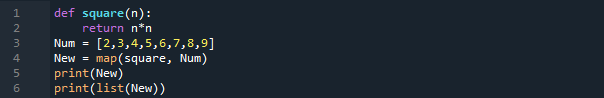 You can try the map function with the list type variable as same as you did for a tuple. So, using the same example in the case of list type, we are squaring the list elements and, after mapping, save them into a variable ‘New’. Print out the mapped variable and, after that, convert the mapped result into list format.