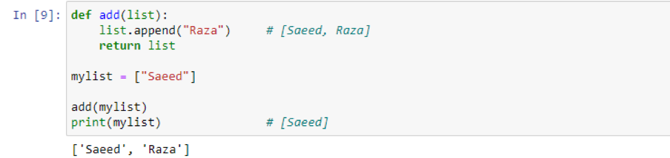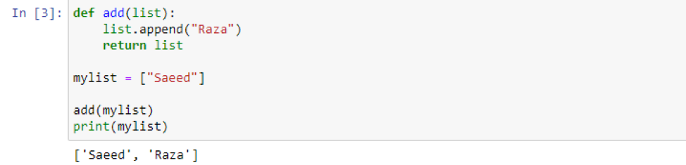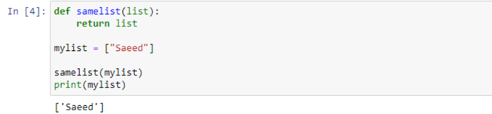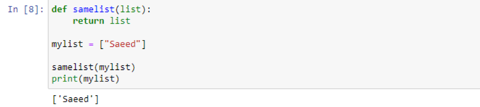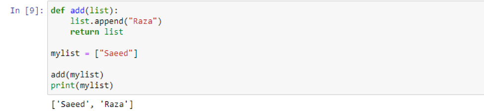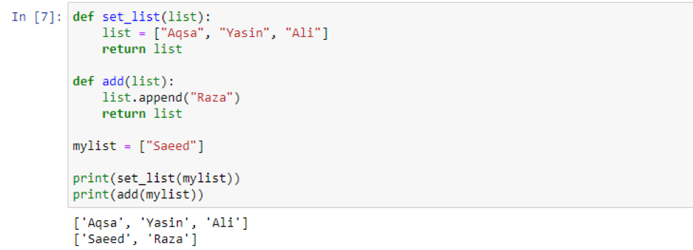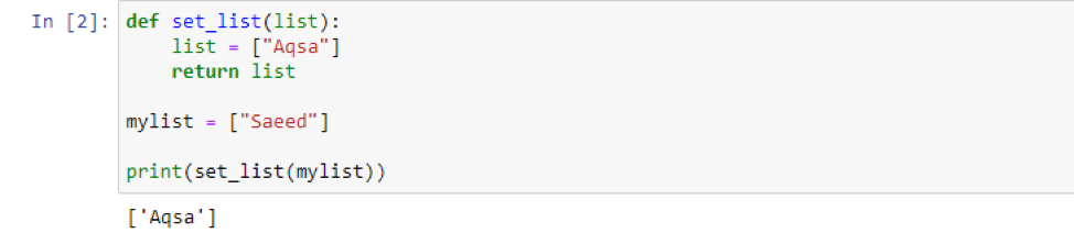 Any action done on the variable or entity would be immediately mirrored to the caller method. The method may entirely modify the value of the variable and aim it at a wholly distinct object. As you can see in the function ‘set_list,’ we have changed the list contents and printed a whole new list having the element ‘Aqsa.’ This is because we have returned the modified list and printed it at the same line as the caller.