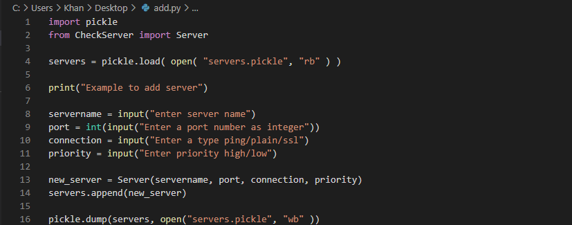 Create a new file named add.py and import pickle package and class Server from the old file Server.py. This file will open the pickle file and will ask you to add some additional information regarding the server as code is shown below.
