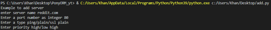 When you run this file, you will get the below output and it will ask you to add server name, port, ping type, and priority.