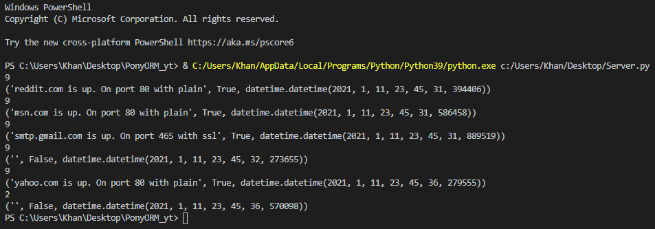 While, when you run the Server.py file again, you will get the information regarding the old server, as well as the history of the new server you have provided in the above image.