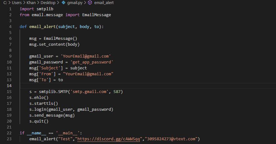 Now create a new file named gmail.py and import some packages required. Then create a method named email_alert() that creates an alert to send on the email while providing email and password information.
