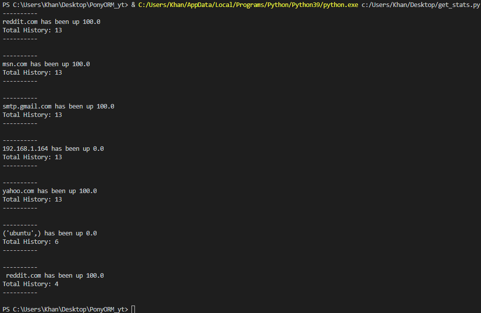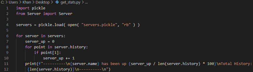 Now you have to create another python file named get_stats.py within the same directory. This file has imported the Server class from the Server.py file. The code written below will look upon our pickle file, which is loaded in, and print the history of each server and how much that particular server has uptime.