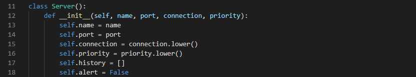 Let’s create a class named Server() and built a first method, which is a constructor method. We have added some attributes for the server, e.g., any UNIX or regular computer. Let’s have a look at each:
