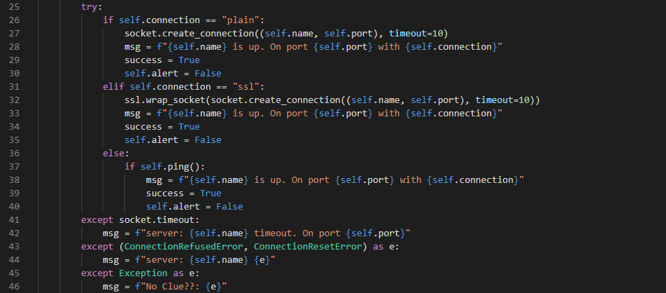 Now write the below code in the same file, and using the try statement, we are checking the connection for different servers connection types, e.g. plain, SSL, and ping. In this try statement, we have if statement having a connection of plain type. It will create a connection with the provided name and any port number you provided. If the connection is successful, it will generate a success message, e.g., msg. It will turn the Success variable to True and no alert will be sent to email. We have else if statement with a different connection type, and in the last if statement we have a ping() function called. In the except statement, if the socket has run out of time, a connection is refused, or anything else, it will display a failure message.