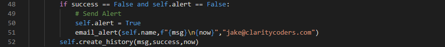 On the other hand, if the success status and alert are False, it will change it to True and send an alert to the provided email and call the create_history() function to create a history.