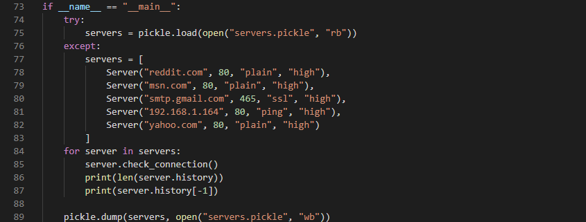 Now we have to make sure that we are running the main program. The If-statement will check if it is the main program or not. The try statement will load the server pickle file if it already exists. If it does not exist, the except statement will get a whole new list of servers. For any of the servers, connections will be checked and history will be saved. On the other hand, we have to save our data to the pickle file using the dump statement.
