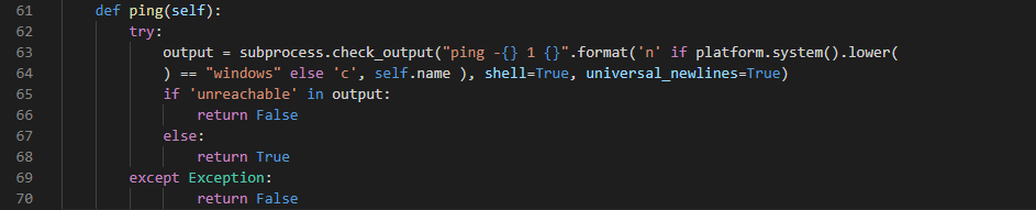 The ping() function will ping the server or computer. If the ping is successful, it will output True, and if the connection failed, it will return False.