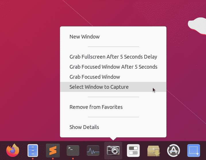 Now whenever you click on “The Screenshot App”, it will capture a full screen screenshot and store it in ~/Pictures directory. More options are available when you right click on the app icon.