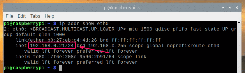 As you can see in the screenshot below, the static IP address 192.168.0.21 is assigned to the ethernet network interface eth0 of my Raspberry Pi 3 Model B as I wanted.
