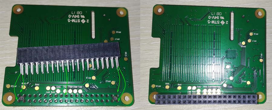Before you can attach the Sense Hat board to the Raspberry Pi, you have to connect the 40-pin header to the Sense Hat. Connect the male pins of the 40-pin male-female header to the Sense Hat as shown in the images below.
