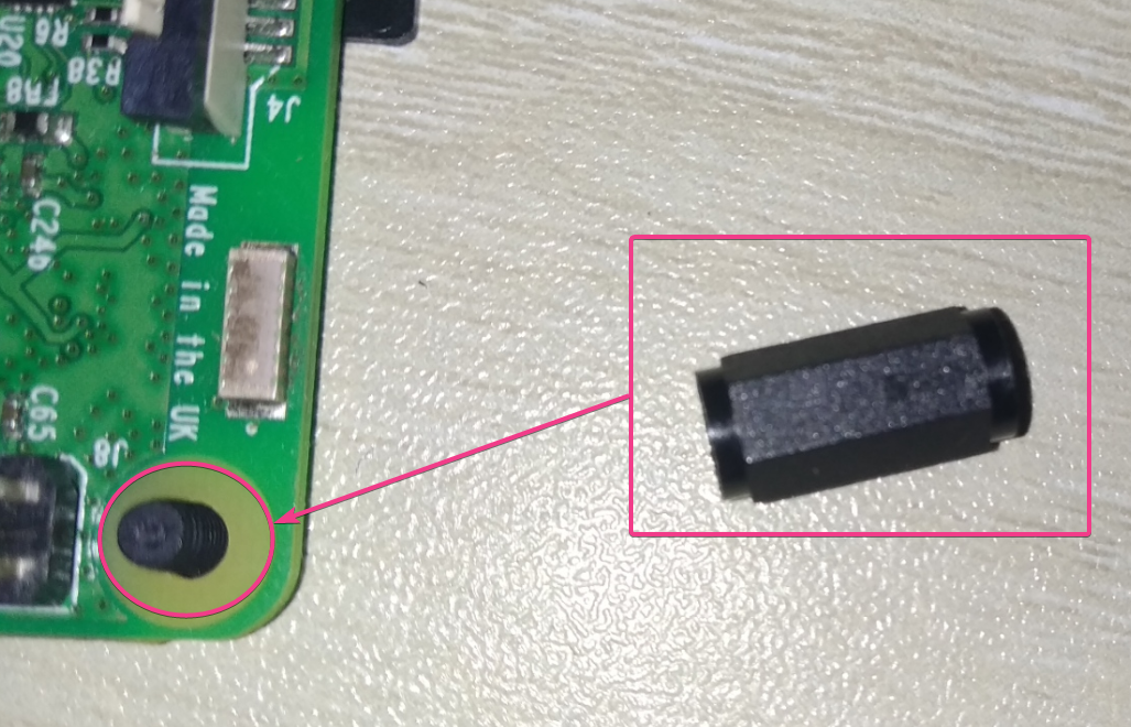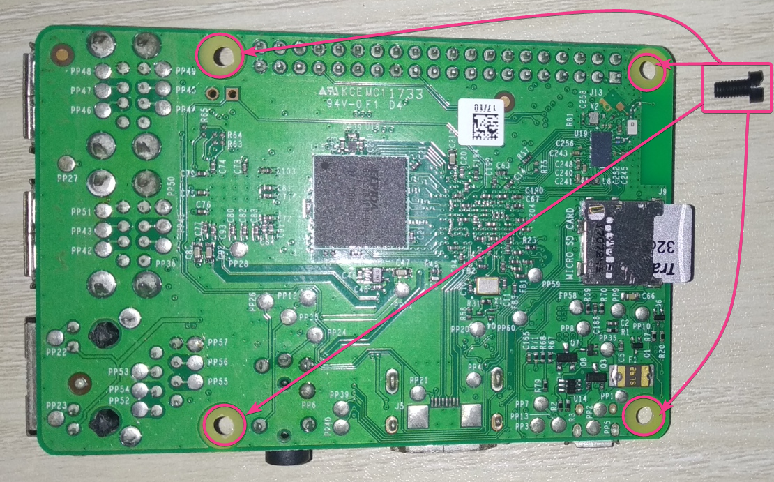 Raspberry Pi single-board computers have 4 holes that can be used to attach add-on boards or a case. To attach the add-on board, insert screws from the back of the Raspberry Pi, as shown in the images below.