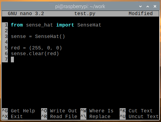 Enter the following code in the test.py file. Line 1 imports SenseHat from the sense_hat module, line 3 creates a SenseHat object and stores a reference in the sense variable, and lines 5–6 set the color of all 8×8 LEDs to red. Once you are done, press <Ctrl> + X followed by Y and <Enter>.