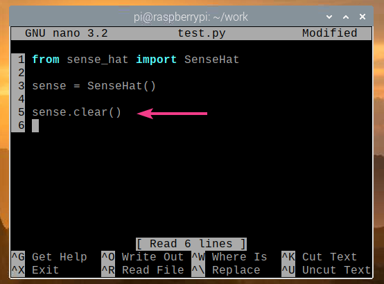 To turn off the LEDs of the Sense Hat, run the clear() method without any color value in the test.py Python script, as shown in the screenshot below, and run the test.py Python script again.