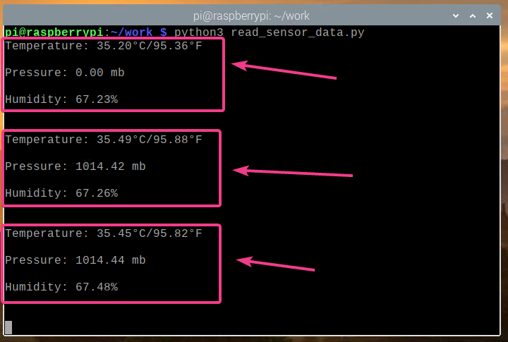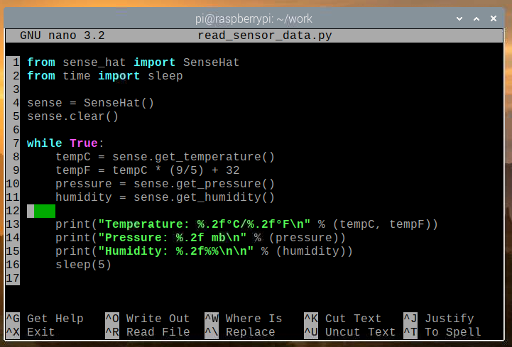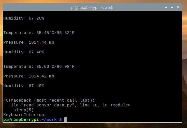 Now that we can read the sensor data from the Sense Hat, press <Ctrl> + C to stop the program.