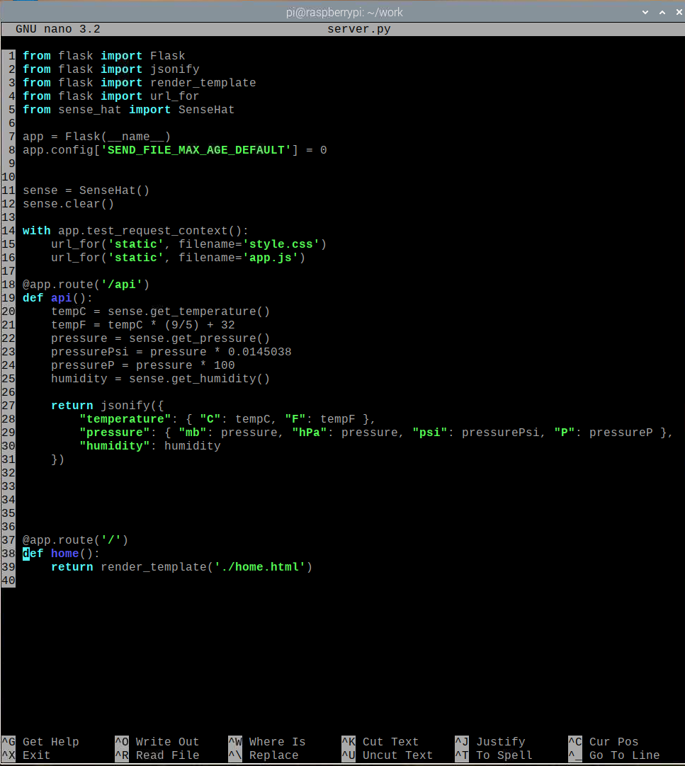 Lines 18–31 read the sensor data from the Sense Hat and return the API data in JSON format on HTTP GET request in the /api endpoint of the web server. Lines 37–39 return the weather web app homepage on the / endpoint of the web server. The homepage is rendered from the home.html file, which should be in the templates/ directory of the project directory.