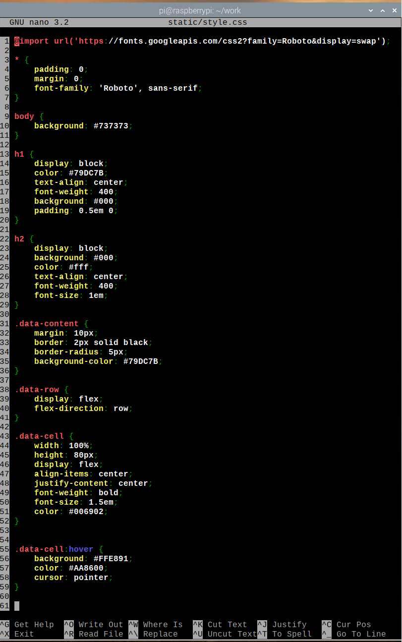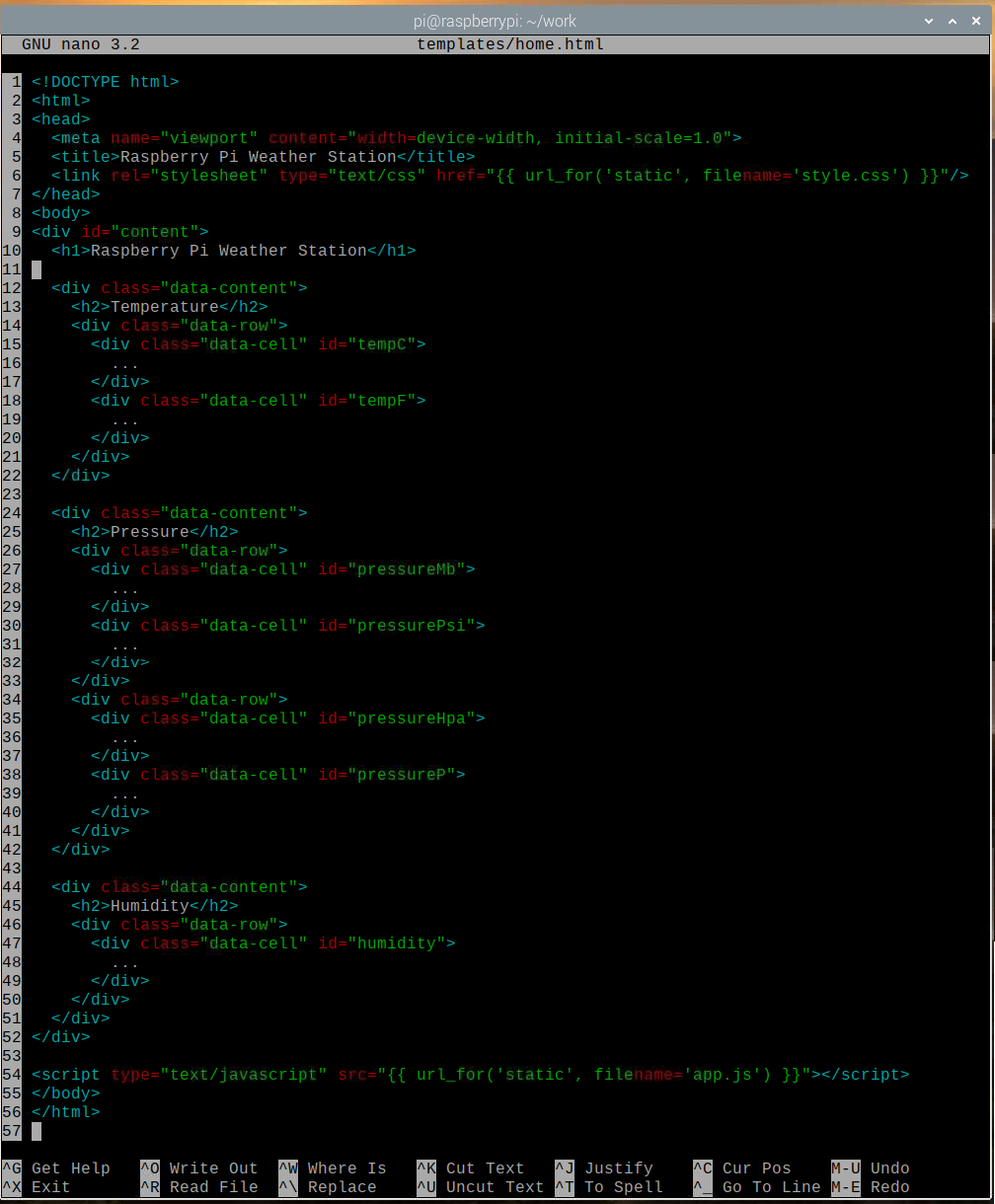 Lines 14–16 are used to allow access to the style.css and app.js static files. These files should be in the static/ directory of the project directory. The style.css file is used to style the home.html homepage, and the app.js file is used to request the API data from the /api endpoint and update the weather data on the home.html page every 5 seconds.