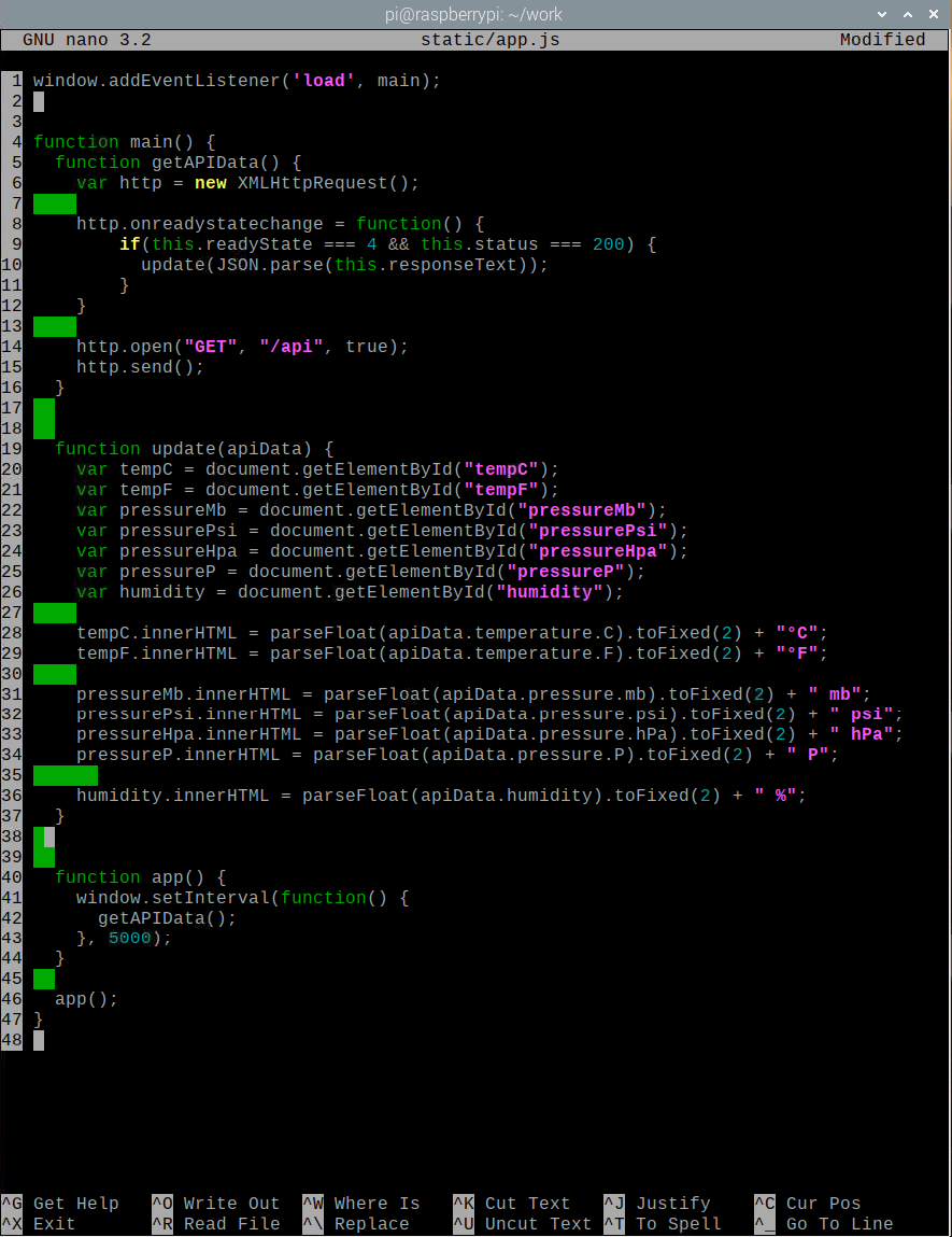 Then, press <Ctrl> + X followed by Y and <Enter> to save the app.js file.