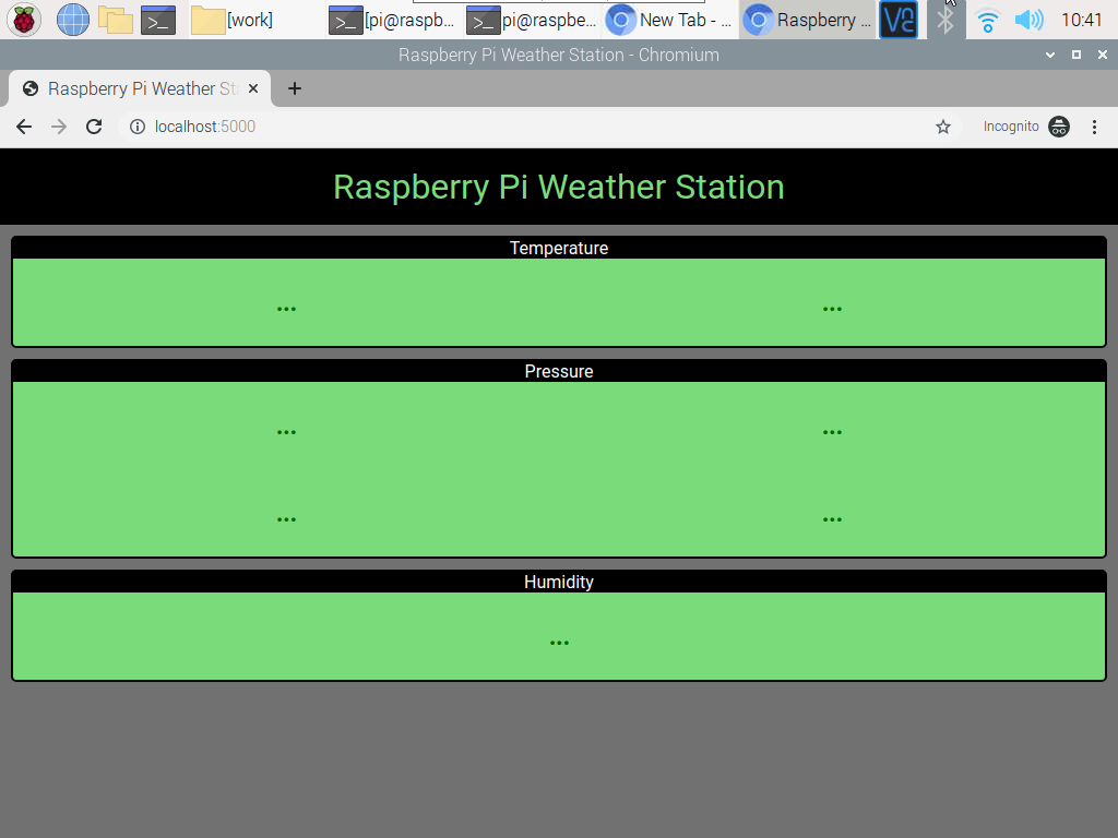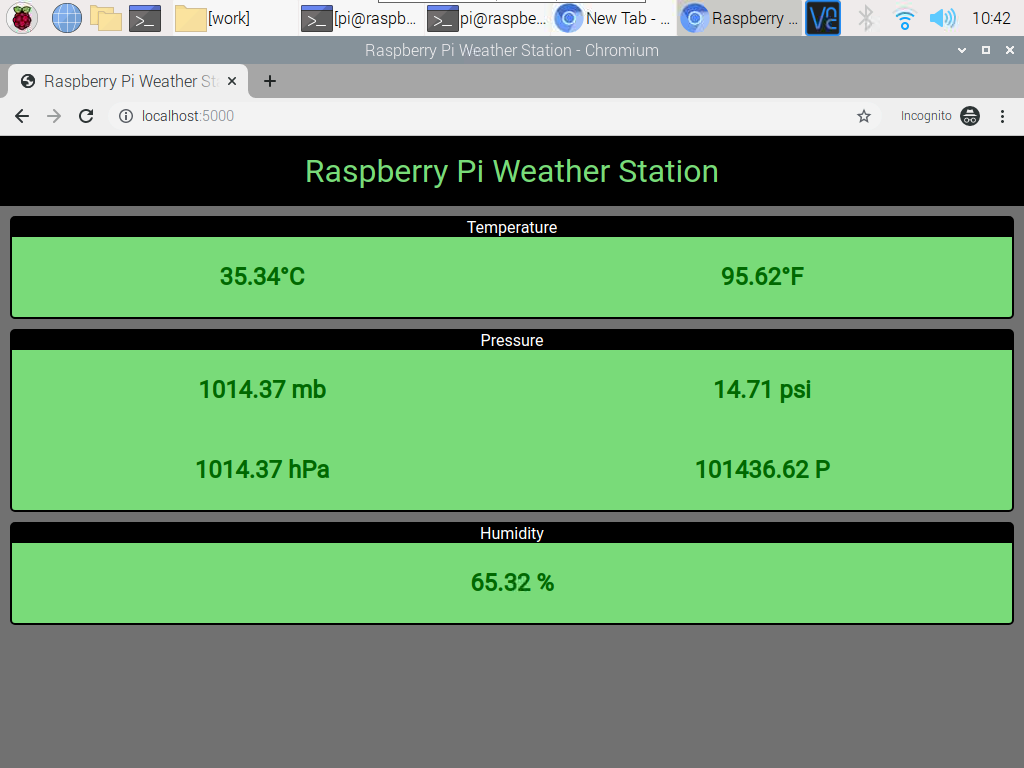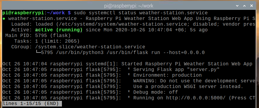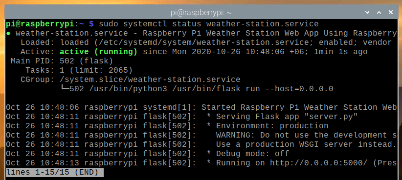 Once your Raspberry Pi boots, the weather-station service should be running, as shown in the screenshot below.